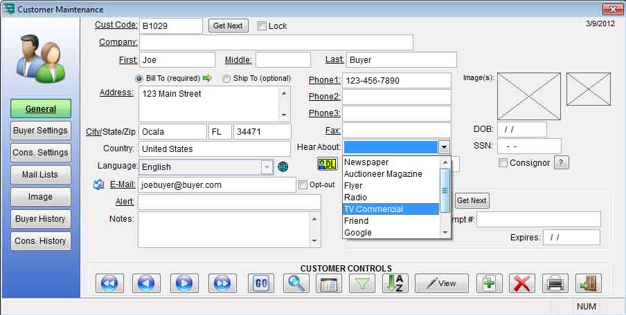 down menu in the customer record may be changed from auction to auction. This provides excellent information regarding how new