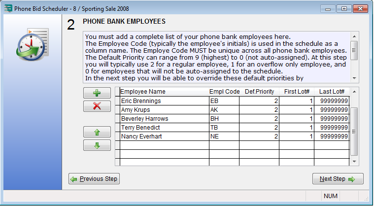 As you can see, the various criteria above can make for a daunting manual task that takes many, many hours and results in a sub-optimal schedule at best. The Auction Flex phone bid scheduler takes into account all the criteria above and automatically produces a schedule that optimizes both employee-to-phone bidder stickiness and lots between phone calls. When the phone bid scheduler has generated the schedule, it then produces: